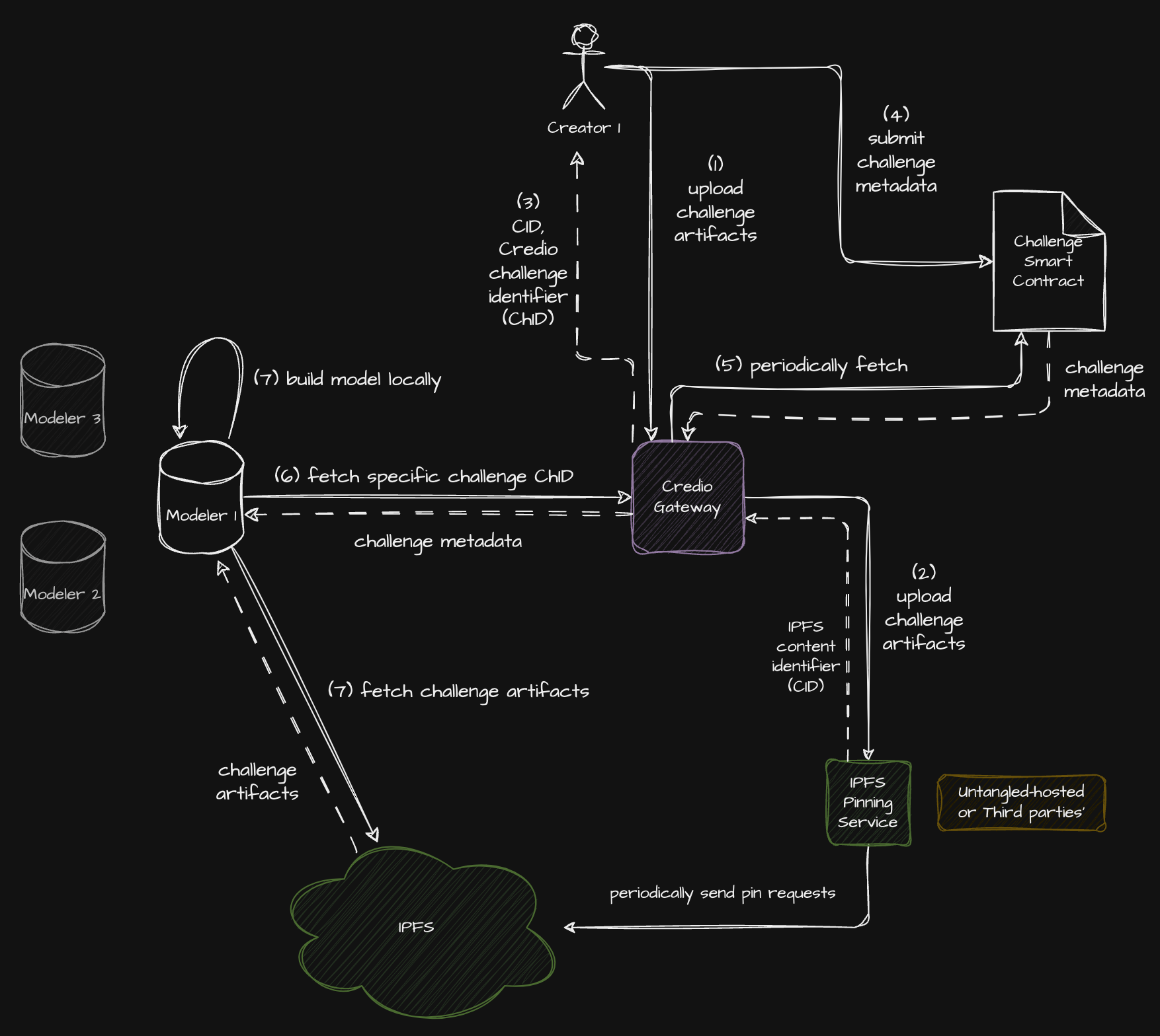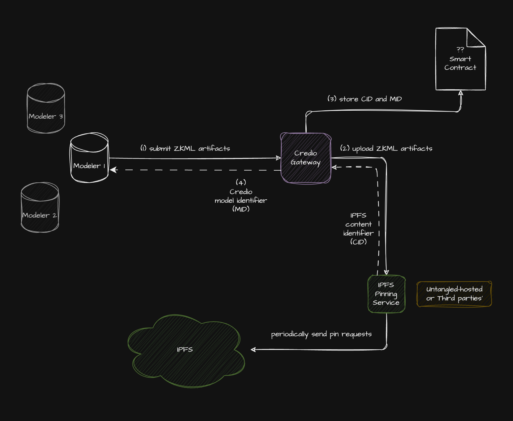 Submitting a model is a progress that the Modeler accepts to join a challenge by providing their ZKML model’s data to the Credio smart contract (short definition). The supported ZKML model’s data format at the moment is the content’s identifier in the IPFS network of the ZKML model that at least contains the following information: The ZK circuit of the model; The necessary ZK verifying keys/smart contracts; The inference API specifications (protocol, host, endpoint, payload structure, etc.). To obtain the IPFS content’s identifier, the Modeler can use any IPFS gateway to upload their files to the IPFS network. Credio CLI also supports this desire by providing an artifact-based uploading feature via the following command: