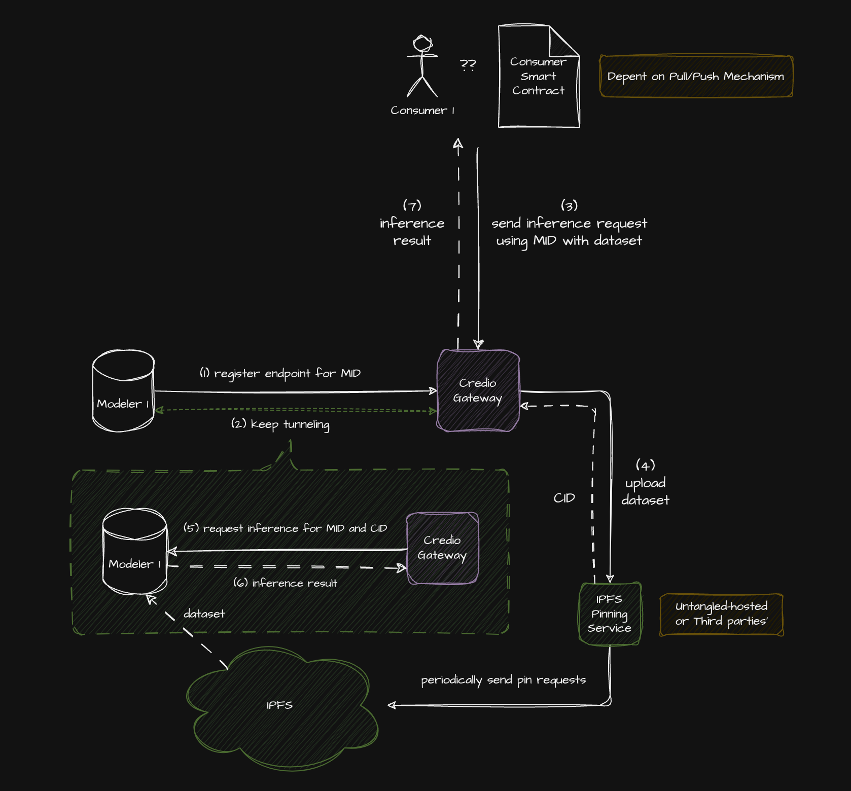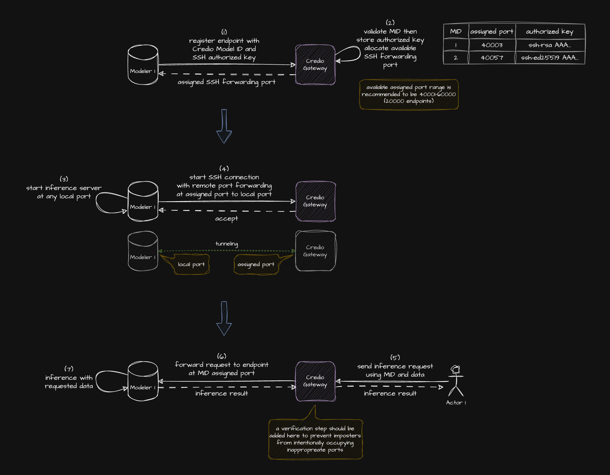 For exposing local inference servers to the Internet, the Credio platform allows verified Modelers to start authorized secure connection (tunneling) to the Credio gateway and open a publicly-accessible endpoint for serving inference requests. To register an endpoint for a specific submitted ZKML model, the Modeler can use the following command: