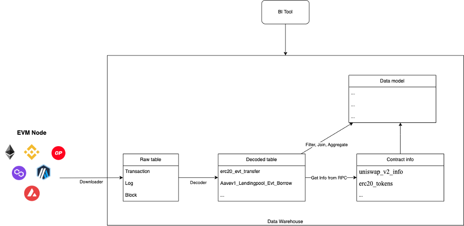 The raw tables store unprocessed data directly retrieved from APIs provided by the RPC service. For each EVM (Ethereum Virtual Machine) chain, we maintain four primary raw data tables:
